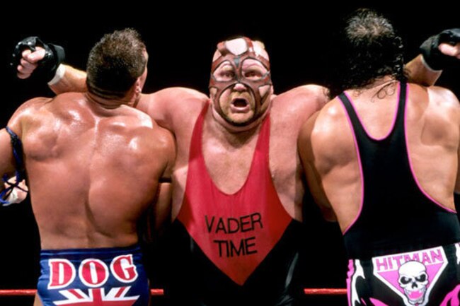 Vader clotheslines Bret Hart and The British Bulldog