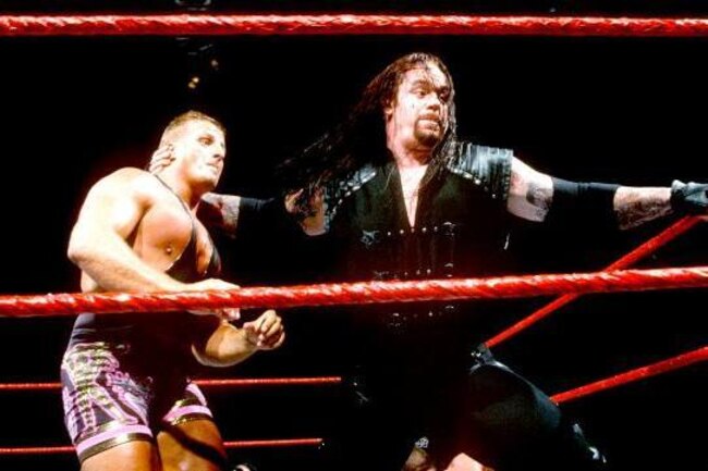 Undertaker looks to send Owen Hart's head into the turnbuckle.